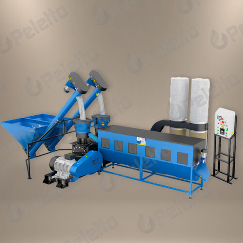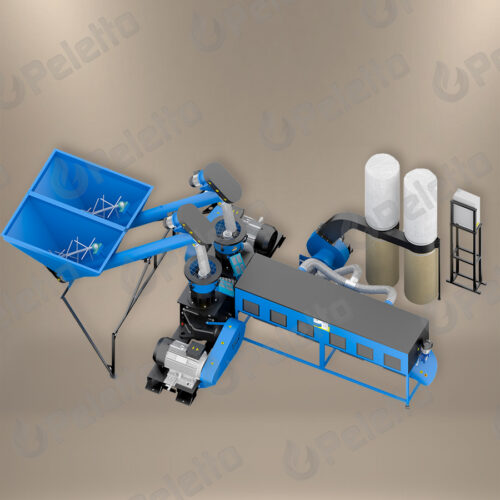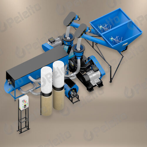 The PELETON 3000 DUO line is a reliable and high-quality pellet and animal feed production equipment. It has two PELETON-300 pelletizers on board. It is capable of producing pellets ranging in size from 2 mm to 8 mm from various types of raw materials. This set differs from the PELETON-300 series pelletizing line in that it is equipped with 2 powerful pelletizers (22kW x 2), which process twice as much raw material. The production line can process different types of raw materials into fuel pallet or feed.